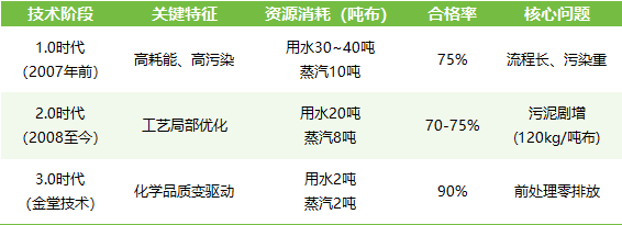 传统印染长期困于“质量-成本-环保”的恶性循环。金堂V3.0技术通过理论指导下的化学品体系重构与专利技术应用: